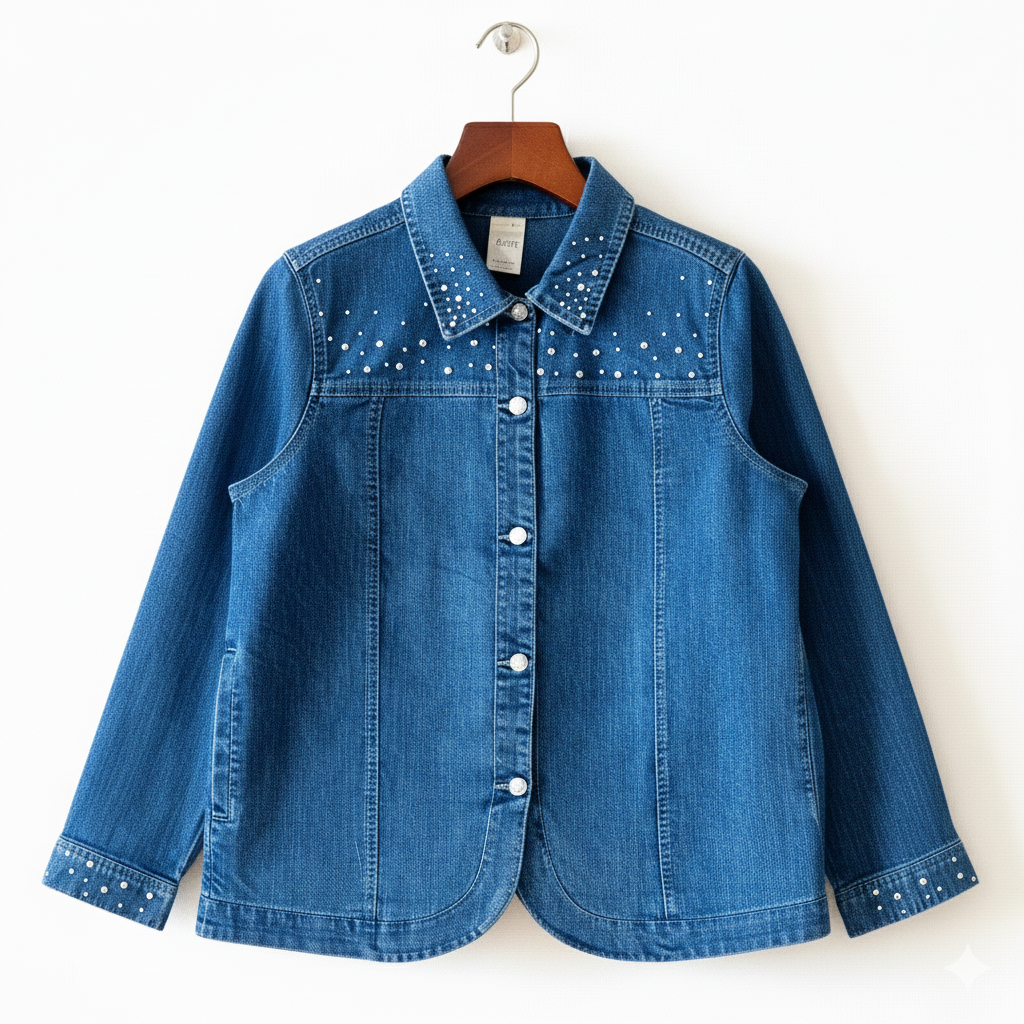 This blue denim jacket is a versatile essential for any wardrobe. With a regular fit, it features two pockets and a button-down front with beads on front and cuffs, offering both style and practicality. The denim fabric provides durability, while the classic design makes it ideal for layering over any women’s outfit, whether casual or semi-formal.